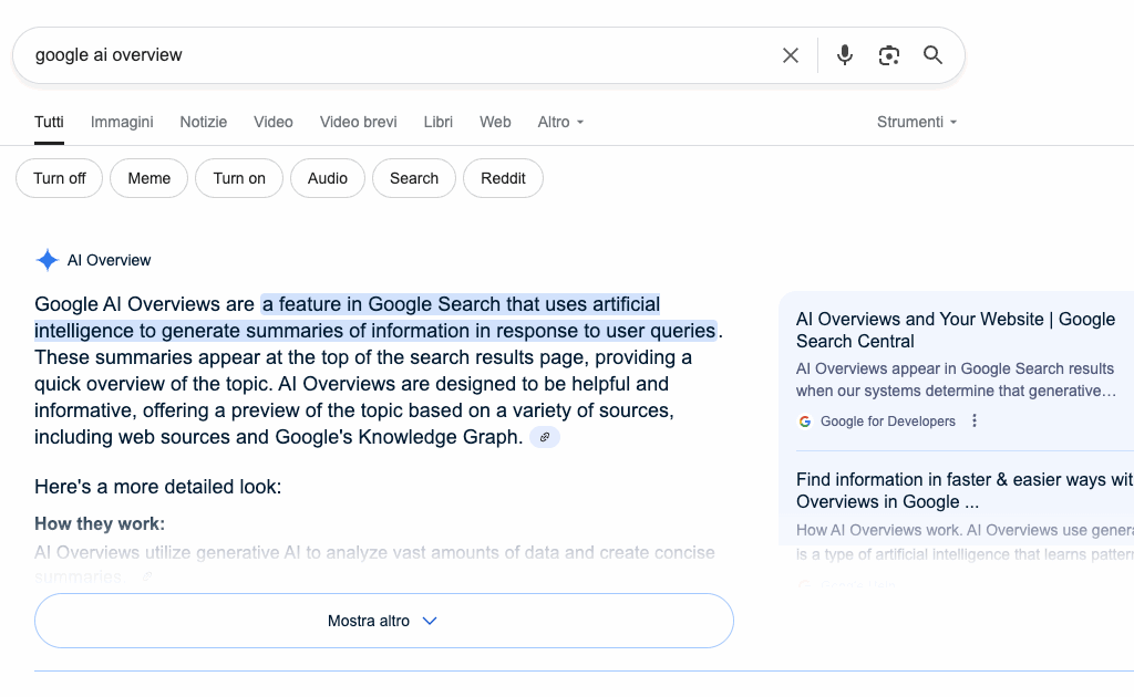 A differenza dei tradizionali featured snippet, che estraggono contenuti da una singola fonte, l’AI Overview integra e rielabora informazioni da più pagine web. Il risultato finale è una risposta originale che combina diversi frammenti di conoscenza in un formato facilmente comprensibile, accompagnata da collegamenti alle fonti utilizzate per l’elaborazione.